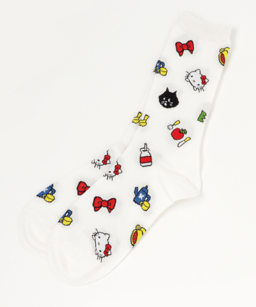 にゃー×HELLO KITTYのコラボレーションアイテム。にゃーとキティのカラフルなデザインのソックス。