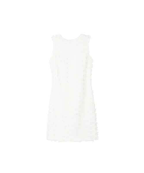 立体フラワーレースを全体に使用したワンピース。フラワー部分を一つ一つカットした、とても贅沢なレースです。シンプルかつ美しいシルエットが、生地の個性を引き立てます。レストランウエディングや二次会等に是非。レザージャケットやカーディガンでお出かけスタイルにも。 バックファスナーで着脱。