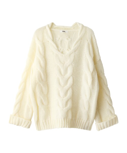 大きめなケーブル編みに、ぬくもりを感じるニットプルオーバー。 ボリューミーな折り返しの袖口は、仕草をキュートに印象付けるポイント☆ デコルテを大胆に見せるVネックと、ルーズなサイジングが、女性らしいヌケを感じさせます♪ ★伸縮性があります。 ★素材の特性上、カラー・形・サイズが、写真・サイズ表示と多少異なる場合があります。