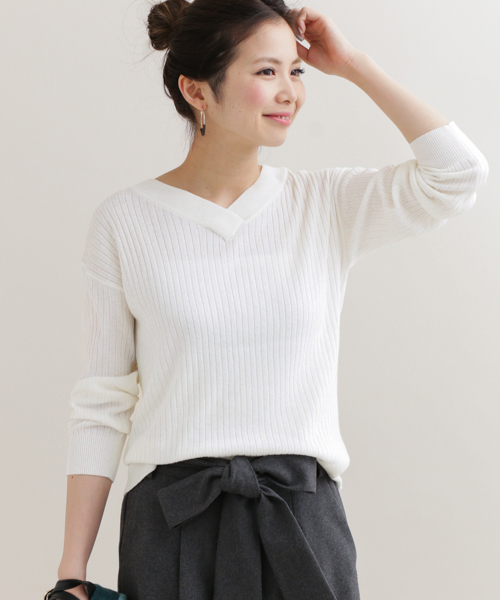 簡単に家洗いできるウォッシャブルニット。 伸縮性があるので程好くボディにフィットし、着心地も滑らか。 リブニット素材を使用しカジュアル感がプラスされた1枚。今季らしいVネックデザインでデコルテをキレイに見せ、女性らしい着こなしをアシストします。 ※透け感あり ※伸縮性あり