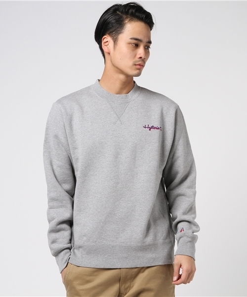 『ベーシックな中にも、さり気なくウィットに富む一枚』 誰もが知るスウェットの王者へのリスペクトを込め、そのロゴをサンプリング&アレンジした左胸のワンポイント刺繍が、さり気なくも目を惹く一枚。また左の袖口にあしらったHYS GIRLのミニパッチも小気味良いアクセントになっています。シンプルな中にも、HYSTERIC GLAMOURらしい遊び心を感じさせるアイテムです。 裏毛に極太の糸を使った裏起毛のボディは、ふっくら柔らかな肌触りと暖かな着心地が魅力。仕上げに特殊な加工を施し、表面に独特の凹凸感を与えた表情豊かなスウェット地となっています。 『あえて大きめサイズを選ぶと、今年らしいルックスに』 胸のワンポイント刺繍がユニークでありながら、全体はシンプル&ベーシックなアイテムなので、合わせるスタイルを問わず、幅広く活躍する万能選手です。あえてオーバーサイズを選び、旬のビッグシルエット風にオフショルダーで着こなすと、いっそう今どきのバランスに仕上がります。