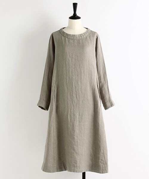 さり気なく入れたヘリンボーン柄で表面に凹凸感を出した、Aラインシルエットで着回しの効くポケット付きワンピース。しなやかな風合いのウィンターリネンの表面には起毛をかけ、ナチュラルテイストでふっくらとした暖かみのある素材を使用しております。シンプルなデザインですのでカーディガンやコートとも合わせやすく、すっきりとしたボートネックはインナータートルとも相性抜群です。