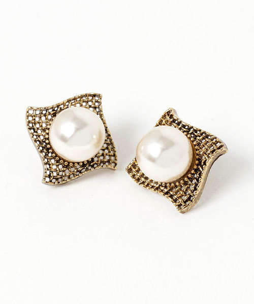 大きいパールモチーフが印象的なピアス。ゴールドカラーとの組み合わせが女性らしいアイテム。アンティーク風のデザインもポイントです。