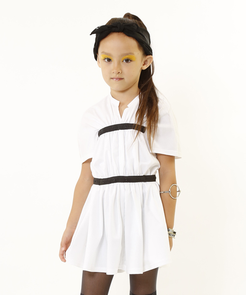 テープデザインがポイントのワンピースは、ボタンを後ろで留めたり、おなか部分のボタンを胸の部分に留めてチュニックにしたりと、発想次第でいろんな着こなしを楽しめちゃう1着です。