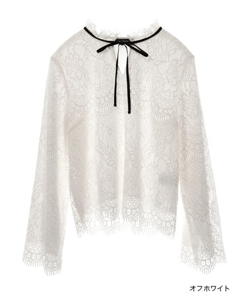 襟元のベロアリボンや繊細なレース使いがクラシカルな印象のプルオーバー。裾や袖のスカラップデザインもアクセントになり可愛らしいデザインです。フェミニンなレースの透け感を残しつつ、身頃と袖にはしっかりと裏地付きなのも嬉しいポイント。カーデやコートをオンしてもスッキリと着ていただけます。