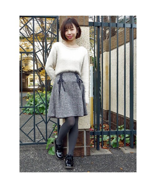 フロントのレースアップリボンが目を惹くスカート。 これからの季節にぴったりのガーリーなツイード素材が乙女心をくすぐります♡ たっぷり入ったフレアーで甘めのシルエットに仕上げました♪ トップスをインしてリボンを見せる可愛らしいスタイリングがおすすめ◎ 後ろがゴム仕様なので、すっきりとしたウエストラインがお楽しみいただけます。 ※dark brownは、ボディの商品画像が実物に近いお色味となっております。 室内・室外の光の当たり具合により一部見え方が異なります。 MATERIAL: モデル身長: 158cm 表地 ポリエステル70%レーヨン30% 裏地 ポリエステル100% made in China サイズウエスト脇丈 Free72〜61cm49cm