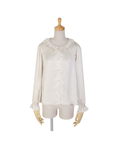 クラシカルなタックのフリル衿が印象的なブラウス。 とろみのあるサテン生地がヴィンテージライクな雰囲気を漂わせます。 フリルが二重になっているので顔周りを華やかに演出してくれるのも嬉しいポイント♡ ニットと合わせて、フリル衿をのぞかせたレトロな着こなしがおすすめです◎ MATERIAL: モデル身長: 158cm ポリエステル100% made in China サイズ着丈胸囲肩幅袖丈 Free58cm97cm34cm58cm