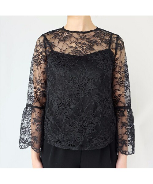 ベルスリーブ風の袖と繊細なレース使いが今年らしいブラウス。きれいめパンツやタイトスカートでフォーマルシーンにはもちろん、デニム等と合わせてカジュアルなコーディネートにも活躍します。キャミソール付き。かぶって着脱。