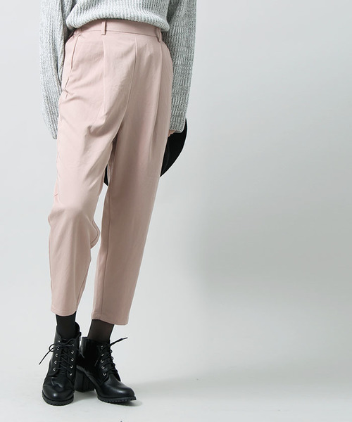 ウエストにタックを施したパンツ。シンプルなデザインで、幅広いコーディネートに合わせて頂けます。 太腿周りに程よい緩さを持たせたテーパードシルエットで、足元をスッキリと見せてくれます。今季人気のハイウエスト仕様で、トップスをインした際にウエスト周りのシルエットが綺麗に見えるひと品。バックウエストはゴム仕様なので、リラックスして快適に着用頂けるのも嬉しいポイント。 今季はベレー帽やチョーカーなど、小物で遊びを効かせたコーディネートもオススメです。