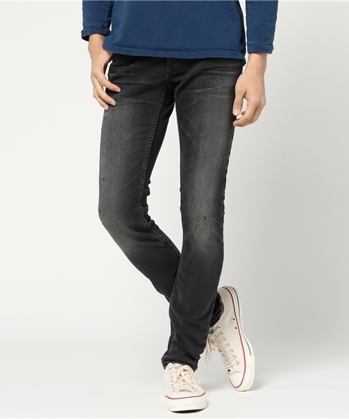 5351プールオム定番のスーパーストレッチ素材のブラック生地をカイハラデニムに別注。ブラックデニムからフェードして作り上げた偽グレーとカーキ、ブラックはワンウォッシュの綺麗に仕上げたスキニーデニム。