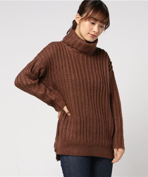 ざっくりのリブ編みで作られたシンプルなタートルニットです。ウエスト周りがもたつかず、ボトムインもしやすいサイドスリット入り。着丈が少し長めになった重ためシルエットが今どきらしいです!