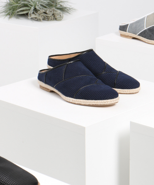 楽チン+デザイン◎ ミュールサンダル【素材】ネイビー織が違う二種類の刺し子の生地を、藍染めで染め上げたマテリアルを使用。OTH織が違う二種類の麻生地を、染め上げたマテリアルを使用。【デザイン】季節感や実用性からデザインしたミュールサンダル。異なる素材でパッチワークを施す事でデザインのメリハリを付けています。アウトソールには、ジュートテープ(葉脈繊維)を巻き、機能性と質感を考えレザーソールを使用しています。サイズ感について ・コンバースやナイキなどといったスニーカーと比較してもおおよそ0.5cm~1cm程大きく作られております。Ex.コンバースで27.0cmを履かれている方は、SIZE:42(26.0cm)程度とお考え下さい。※履き方・足型等、個人差はございますので、あくまでも参考程度にお考え下さいませ。
