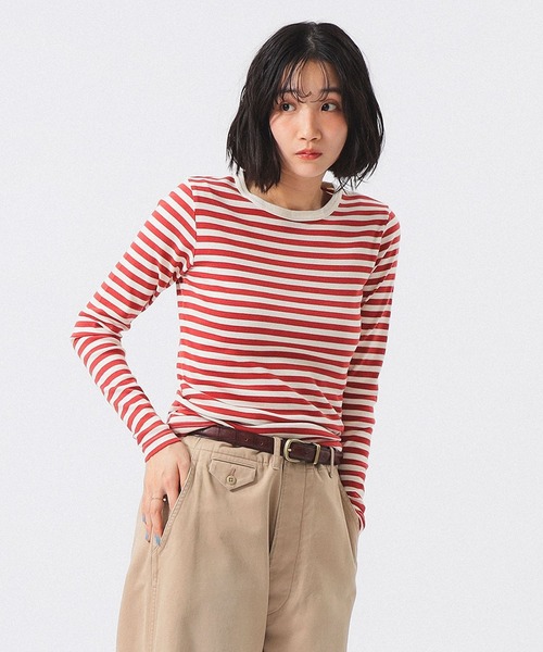 カラーバリエーション豊富な定番カットソー ■デザイン 柔らかな肌触りのフライス地を使用し、程よいフィット感のベーシックなカットソーに仕上がりました。スタンダードなデザインで、1枚あるとコーディネートの幅が広がる便利なひと品です。 ■コーディネート レイヤードスタイルに重宝するカットソー。袖や裾からボーダー柄をちらっと覗かせた、さりげないワンポイント使いとしても活躍します。 ■サイズ フィット感のあるタイトなサイズ感。 ■素材 柔らかい素材感。伸縮性もあるため楽に着用していただけます。 ■ケア方法 洗濯可(詳細は商品についている品質表示ラベルをご覧ください) 【BLACK×OFF WHITE】 Model:H165 B80 W59 H85 Size:ONE SIZE 【NAVY×NATURAL】Model : H161 B76 W60 H82 Size : ONE SIZE 【PINK×WHITE・WHITE×BLUE】Model : H164 B72 W59 H85 Size : ONE SIZE 【RED×WHITE】Model : H165 B80 W59 H85 Size : ONE SIZE 生地の厚さ:普通 透け感:ややあり 伸縮性:あり 光沢感:なし 裏地:なし 【スタッフレビュー】 スタッフ:よしの 身長:153cm / 普段サイズ:S / 着用サイズ:FREE サイズ感: インナーに最適なタイトフィット。 素材感: 体に密着してもストレスの無い柔かい素材。 ポイント: レイヤードしやすいシルエットなので通年着られます! スタッフ:品川 智美 身長:158cm / 普段サイズ:M / 着用サイズ:FREE サイズ感: 身体のラインに沿う細身のシルエット。 素材感: 柔らかく薄いコットン生地。 ポイント: Tシャツやスウェットのインナーに着用し、ボーダーを覗かせて着るとアクセントになって可愛いです◎ ※光の当たり具合やパソコンなどの閲覧環境によって実際の色味と異なって見える場合がございます。予めご了承ください。 ※商品の色味は商品単体で撮影した画像をご参照ください。