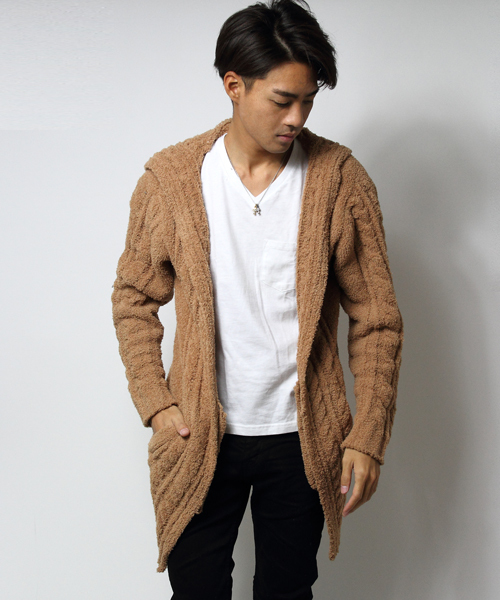 Luv maisonから着心地抜群なフードコーディガンが登場!! ベアフットと同じマイクロファイバーニット素材を使用した着心地抜群のコーディガンは、羽織るだけで今季のトレンドをおさえる万能アイテム。コートを羽織るには少し暑いときに最適のアイテム。付属でフロントを留める大きいピン付き。 カラーはブラック、グレー、ベージュの3色、サイズでM〜Lの2サイズで展開中。
