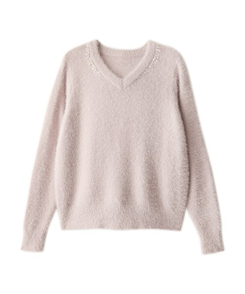 デコルテがスッキリとキレイに見える、Vネックに仕立てたニットトップス。 ネックラインに散りばめられた、パールビジューが女の子らしいアクセントになっています◎。 シーズンらしいウォーミーな、フェザー素材も魅力的です☆ ★伸縮性があります。