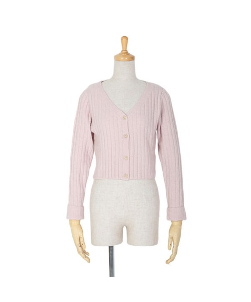 ふわふわとした素材感がうれしいリブニットカーディガン。 きらりと光るビジュー釦は小さなパールもあしらわれており、繊細なイメージです♪ Vネックの衿ぐりとコンパクトなシルエットで、すっきりと着こなせるアイテム。 折り返した手元でちょっぴりトレンド感もプラス♪ 着回し力抜群で、ワードローブにも是非加えたい一着です♡ MATERIAL: モデル身長: 150cm アクリル54%ナイロン42%ポリウレタン4% made in China サイズ着丈胸囲肩幅袖丈 Free45cm84cm32cm55cm