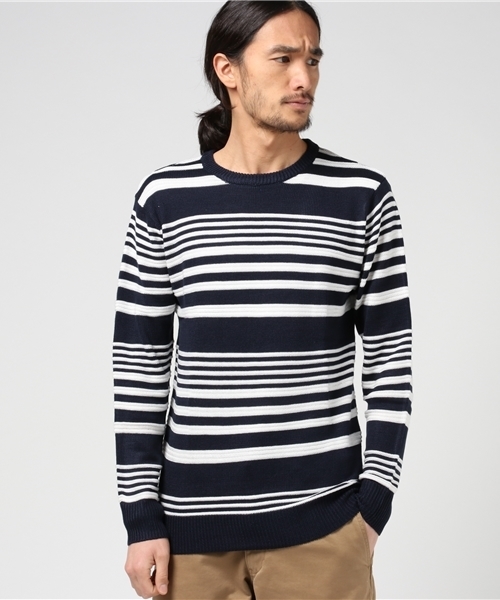 ピッチに変化のあるリズミカルなマルチボーダーのニット。リンクス編みと呼ばれる編み方で表現すことにより、立体的な表情に仕上がっています。コートを脱いでも様になるデザインニットで差を付けて!