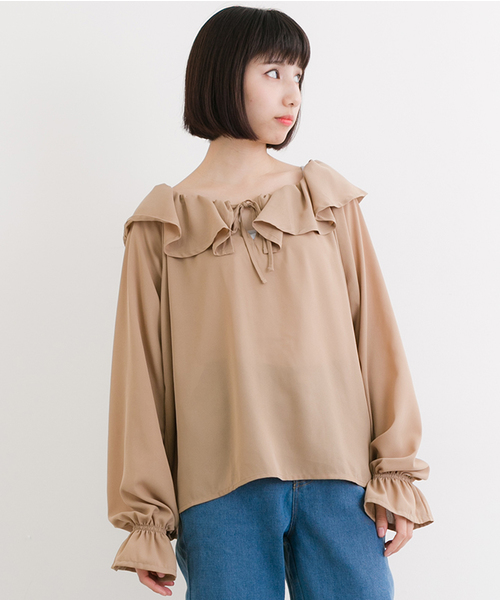 袖口ゴムのベルスリーブと大きな襟のシフォンプルオーバー。肩口にもゴムが入って調節できるオフショルタイプ。 上品な透け感のシースルーは、ハイネックニットと合わせたスタイルで今から春まで使えるアイテムです。