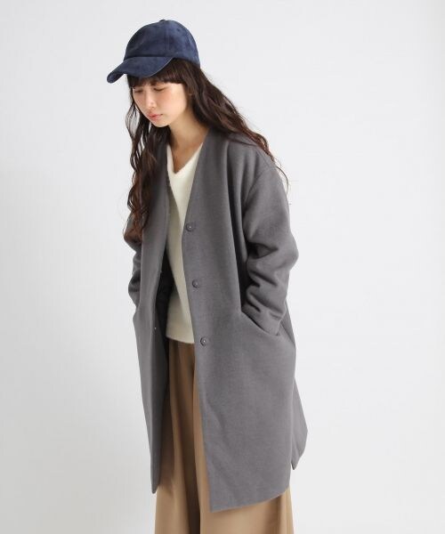 滑らかな手触りが気持ちの良い、今年注目のノーカラーVネックのシンプルコート。ストールも巻きやすいすっきりとした襟元で、タートルネックや襟付きのトップスとも相性が良いデザインです。ドロップショルダーなので、ゆとりを持って羽織ることが出来るのも着やすいポイント。裾にはスリットを入れて足さばきも良く仕上げ、トレンドと着心地を兼ね備えた一着です。