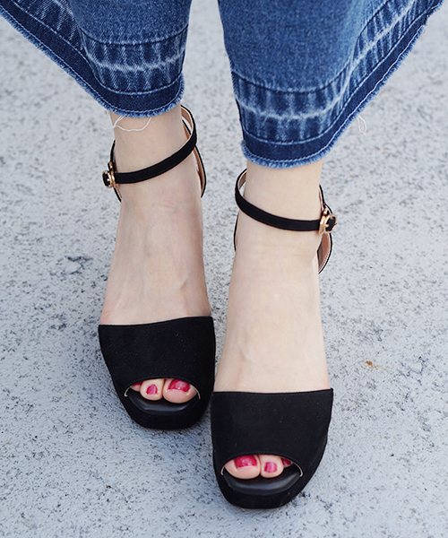 ヒールを少し丸みを帯びたフレアー型にした、ヒールのデザインが目を引くサンダルです。ホールドする面積が大きい甲のデザインと足首のストラップ仕様が、安定感があり足が痛くなりにくいデザインです。ヒールは10.5cmと高めですが、ストームが3cmあるので安定感がありスタイルアップさせてくれます。ヒールもチャンキーヒールとなって、トレンド感アップ!夏のスカートから、フリンジデニム、パンツスタイルまで幅広くコーディネートして頂けるサンダルです。 ※ブラックのみヒールは甲素材と同じスエード素材となります。 ※こちらの商品はサンプルの為実際の商品とは仕様が異なる場合があります。 ※取り扱いについては、商品についている品質表示でご確認ください 。 ※店頭及び屋外での撮影画像は、光の当たり具合で色味が違って見える場合があります。 ※撮影に使用している小物雑貨はスタッフの私物になります。