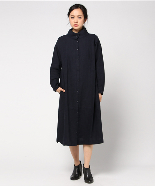 前後どちらを前にしてもOKで、さらに羽織りとしても使える3WAY設計のワンピース。リネンならではの粗野な風合いはそのままに、レーヨン混で落ち感を加えた長いシーズン着られる素材感となっています。冬の間はパンツやタイツと合わせて、あたたかくなったら一枚でと着回し力の高さもピカイチ♪