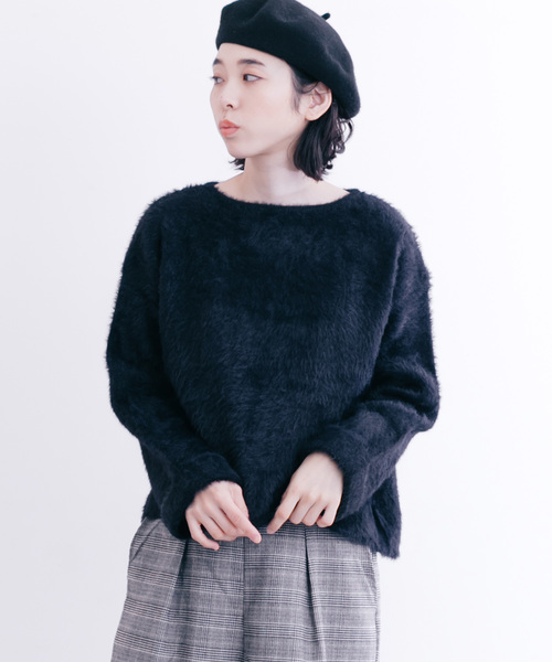 ストレッチの効いたふわふわと滑らかで肌触りの良いシャギーニット。シンプルな型ですがドロップショルダーにロールアップデザインのロングスリーブが今年らしいです。程よいフィット感で着ぶくれしにくく、どんなボトムスにも合うアイテムです。