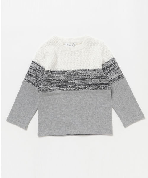一枚で主役になるデザインアイテム! ニットとカット素材の異なる素材を組み合わせたデザインアイテム。 ニットは表面感のあるデザインで変化があり、存在感のある仕上がりに。 カット部分は厚手素材で、春先まで長い期間着ていただけます。 綿100%素材なので肌にやさしく、お子様にも優しいアイテムです。