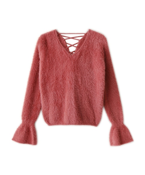 ふわふわの毛並みがマイルド&シーズンライクな表情を演出するシャギーニットトップス。 バックスタイルにあしらったレースアップデザインが魅力です♂ ふんわりと広がるベルスリーブが、女性らしさを惹き立てます♪ ★伸縮性があります。