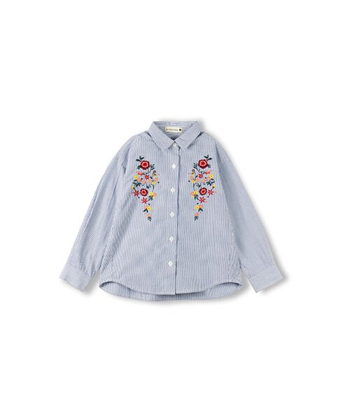 胸元に入った花柄刺繍が可愛い長袖シャツです。細ストライプにすることで、ちょっと春を意識した大人っぽい雰囲気に仕上げています。丈感は前後差をつけデザインポイントにしています。