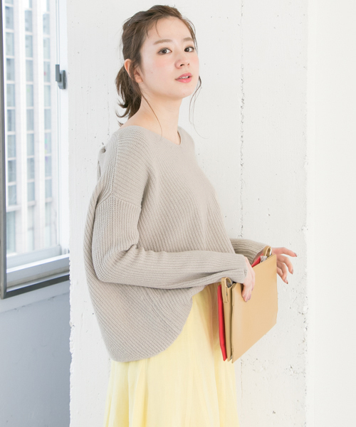 このアイテムはWEB限定商品です。 体のラインを拾わないゆったりシルエットに、畦編みで仕上げることで華奢に魅せてくれるオーバーサイズニット。 バックスタイルにもこだわりを持ち、アウターを脱いだ時にもさり気なくキマるデザインです。 フロントはスッキリVネックでデコルテを綺麗に魅せてくれる、一見シンプルな仕上がり。 バックスタイルはねじりを加えたデザインが表情をプラス。更に裾にかけて広がりを持たせ、開放感を持たせた軽快な印象をプラスさせました。 お袖は袖口に広がりを持たせ、ゆったりとしたスリーブから覗く指先で女性らしさを演出。 これ一枚でコーディネートが完成できる主役のアイテムです。 ※伸縮性あり ※この商品は、デザイン性やファッション性の高い商品です。 そのため、ハンガーでの保管や着用時に伸びることがありますので、予めご了承ください。 ※この商品は、素材の特性上、汗をかいた状態で長時間日光に当たると、変色することがあります。 ※その他お取り扱いに関しましては、商品に付属のアテンションタグをご確認の上、充分ご注意ください。