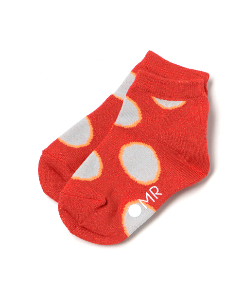 Size: SS(13-15cm) S(16-18cm) M(19-21cm) L(22-24cm)maarookから新しい雑貨ブランド「MR」が2017SSデビュー!! maarookのテイストをそのままに、機能性を重視したありそうでなかった雑貨を展開しています。毎年maarookから出ていた人気のソックスが、今期から「MR」ブランドとして登場です。 大きめのドット柄がかわいいソックスはドットのふちに配色でカラーが差し込まれているのがポイント! 足裏に滑り止めがついているのでベビーから安心して履いていただけます。