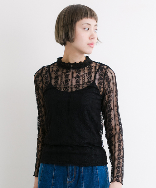 ストライプ状のレースが縦のラインを強調しすっきる見せてくれるブラウス。スタンドカラー風のレーステープが上品な印象に。インナーとしてチラ見せにもおススメの春まで使えるアイテムです。※インナーは含まれません。