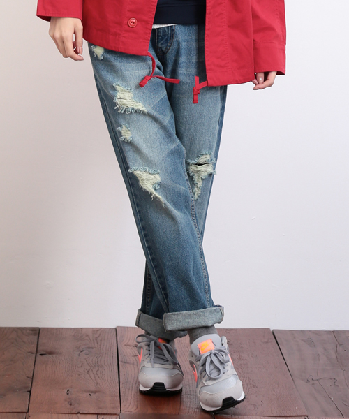 それぞれ大きさの異なるダメージ加工を施したデザインが目を惹くデニムパンツ。トレンドのアイテムだからこそ、自分だけのちょっとしたアクセントが嬉しいですね。コットン100%の素材だからストレッチ性はありませんが、デニムの風合いをしっかりと楽しめます。コットン100%ですが硬すぎず、クタッと程よく柔らかい風合いになっています。 細かなシワの風合いや、穿きこんだ雰囲気の色落ちが素敵です。過ぎず太過ぎず、調度良いサイジングでどんなアイテムと合わせやすいです。ウエストは後ろ部分がゴムになっているので、リラックスな履き心地はデイリーユースにもぴったり。 程よく深みのあるバイオは重たくなりすぎずに着こなせます。