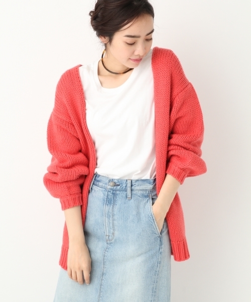ざっくりした編地が今っぽいルーズ感を出してくれるカーディガン。首の後ろ部分をVにしてあるので、抜いて着るスタイリングのしやすいアイテムです。インナーはベーシックな白Tでカジュアルにしてもレースキャミソールで少しだけツヤっぽさを出しても◎同じ素材でプルオーバータイプもありますので、ぜひチェックしてくださいませ。