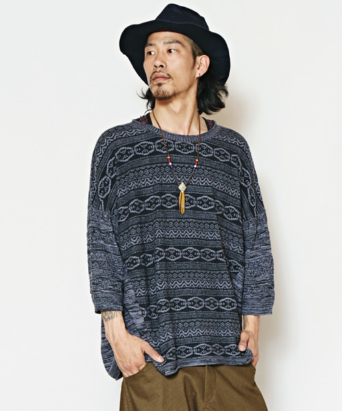 同色系ニュアンスカラーのジャガード織りで表情のあるコットンニットトップス。ビッグシルエットで女性も着用可能。オールシーズン活躍するアイテムです◎ ※こちらの商品は1点1点職人による手作りとなります。その為、形や色合いなど若干異なる場合がございます。あらかじめご了承ください。 Amina Collection Co.,LTD.
