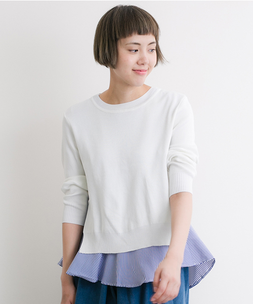 ハイゲージのニットトップスとストライプのインナーのセット。 ニットは背中とサイドにスリットが入っており、ストライプのインナーと合わせればテールカットのぺプラムが広がり可愛らしい印象に。他のインナーと合わせてみたり、ストライプのインナーだけ着用したり様々な着こなしを楽しめるお得な一枚です。