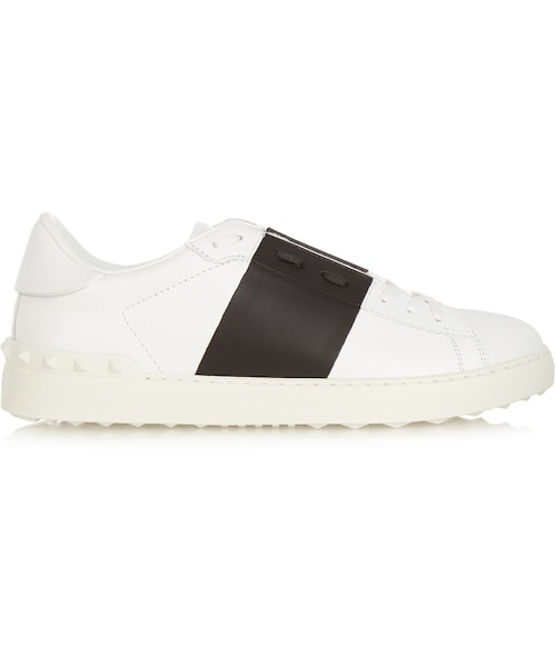 Valentino's white smooth-leather Open trainers are finished with a black side panel and tongue strap for a slick graphic aesthetic. They're distinguished further by t he signature rubber Rockstuds at the heel and sole. Fits true to size.