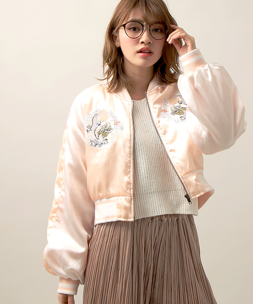 【ViVi 5月号掲載商品】【Popteen 4月号掲載商品】前面と背中に豪華なチャイナ刺繍を施したブルゾン。スカジャンのようなイメージでお使い頂けるひと品。ボリュームのあるシルエットで、ワイドパンツやローキャップなどと一緒に合わせるとトレンド感あふれるコーディネートに。また、光沢感のある素材感は着心地もとてもなめらかです。軽くて合わせやすく、ライトアウターとしても着まわしのきく万能アイテム。