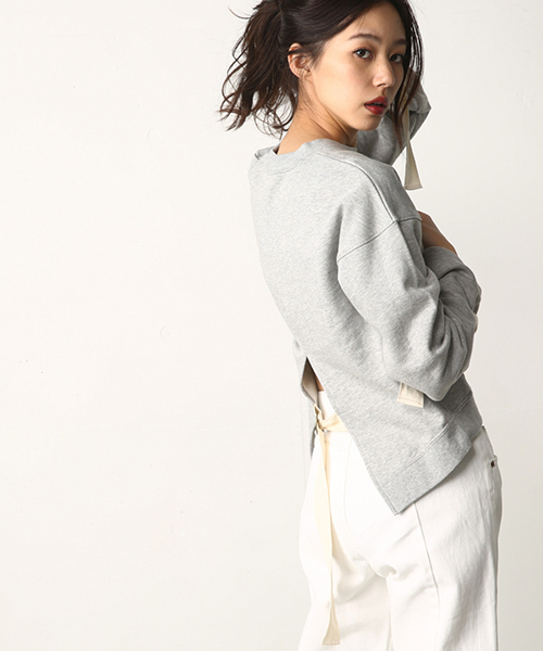 背面に大きく入ったスリットをストラップで留めるデザイン。背中と袖口からストラップが垂れるトレンド感満載かつスウェットなのでカジュアルに着れるアイテムです。