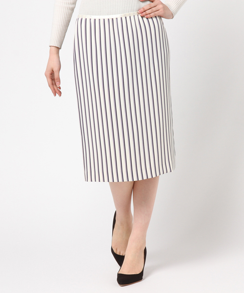 オリジナル柄のマルチストライプのタイトスカートです。ウエスト部分にストレッチバインダーテープを付けて、少し伸びを出して履き心地をよくしました。 ※【853-7136208/ストライププリントブラウス】と合わせてセットアップとしても着用いただけます。