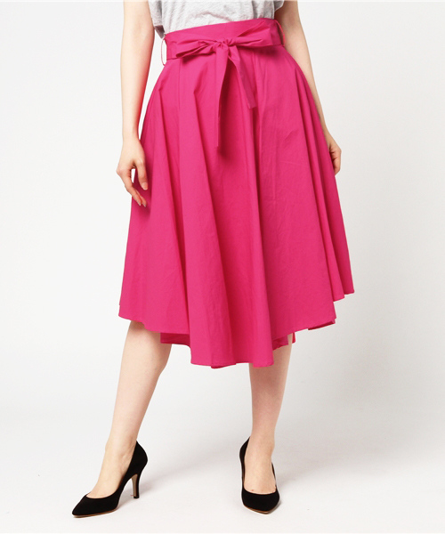 コットンのタイプライターで仕立てたスカート!べーシックなフレアスカートをベースに、イレギュラーヘムラインでデザイン性を加えた垢ヌケな1枚。中央の裾を長めにしていることで、横から見たふんわりシルエットも女性らしさを引き立ててくれそう。ウエストの共地ベルトは取り外しができ、ひと結びやリボン結びなど、コーディネートに合わせてアレンジ出来ます。シンプルや甘めシャツやニットなどシーンに合わせられます。※ベルト取り外し可