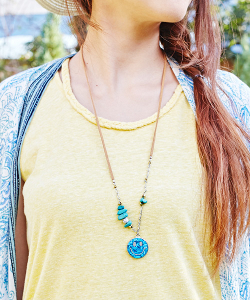 可愛らしいにっこり笑顔をモチーフにしたロングネックレス★小さな天然石・クラッシュストーンを敷き詰めてデザインしました。インドの職人さんのハンドワークですのでひとつひとつ少しづつ違ったお茶目な表情です♪長さ調節可能ですので、お好みの長さにしてお使いください。 ※こちらの商品は1点1点職人による手作りとなります。その為、形や色合い・模様など若干異なる場合がございます。あらかじめご了承ください。 Amina Collection Co.,LTD.