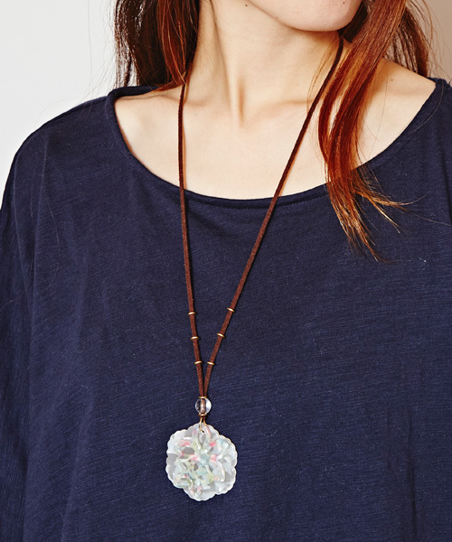 上品な光沢感のある樹脂で作られたフラワーモチーフのネックレス。2枚のモチーフが重なっていて揺れる仕様です。長さ調節のしやすいスエードコードを使用しています。 ※こちらの商品は1点1点職人による手作りとなります。その為、形や色合い・柄の出方など若干異なる場合がございます。あらかじめご了承ください。 Amina Collection Co.,LTD.