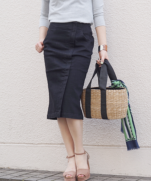 キレイ目に見えるデニム本来の濃色カラーを生かし、ステッチも同色に仕上げたデニムスカート。 斜めに入れた比翼のデザインがヒップから膝までのシルエットを細く見せてくれます。ストレッチが効いているのでストレスフリーに履けるのもポイント! ブラウスやキレイ目カットソーと合わせて大人カジュアルコーデがおススメです。パンプスで大人見せ、スニーカーでカジュアル見せにしたり,シューズ次第で印象を変え様々なスタイリングを楽しめます。 ※濃色の場合、摩擦などにより色移りの可能性がございますのでご注意下さい。 ※取り扱いについては、商品についている品質表示でご確認ください。 ■DENIMの取り扱い方法■ ●色移りが気になる方は、新品を着用する前に一度洗濯をしてください 一度洗うことで表面に付着している染料を落とし、色移りを軽減します 。 ●カバンや車のシート、ソファーなど摩擦を起こしやすく色移りの可能性を感じる場所や物に防水スプレーをかける。(ただし素材によっては効果が無いものもあるので絶対ではありません) ●インディゴ染料はキレイに落とすのが困難なので、淡色アイテムとの着合わせは極力控えていただくことをおすすめします。 デニムは履きこんだり洗濯をして色が落ち、独特な風合いに変化していく過程を楽しむアイテムです。 きちんとケアをし、正しい取り扱いでデニムアイテムを長くお楽しみください 。