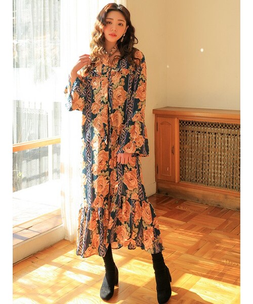 レトロムード漂う花柄ワンピース。 一枚でスタイリング完了な 総柄ワンピは、モテコーデにも! 腰下からプリーツをきかせて 清楚感もプラスした贅沢デザイン。 また、フレアな裾は歩くたびにひらひらと動き、 女性らしさを演出してくれます。