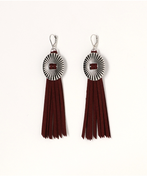 【CONCHO FRINGE PIERCE】 ウエスタン調のコンチョモチーフと、F/SUEDEのフリンジがインパクトのあるピアス。シンプルなニットにさらっと合わせて。
