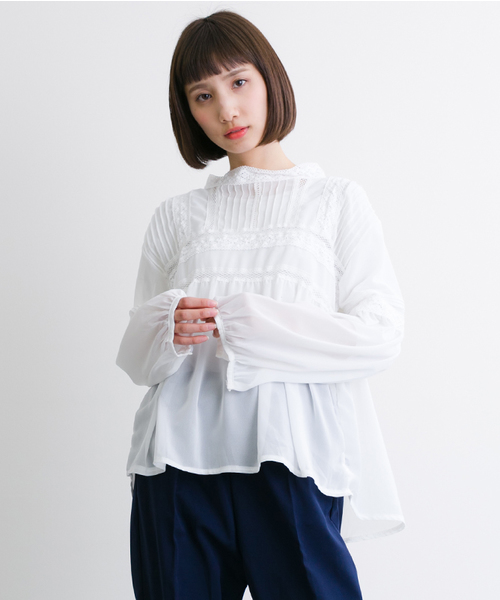 ピンタックとレースがにスタンドカラーがポイントのブラウス。 胸と肘の切り替えしからひらひらと広がる裾がフェミニンな雰囲気でほどよく抜け感をプラス。 女性らしいシルエットを演出してくれます。 ボトムスはタイトからゆるめまで選ばず合わせられるのが優秀な一枚。 インナー次第でパーティからオフィス着にも着れてしまうのもおすすめです。