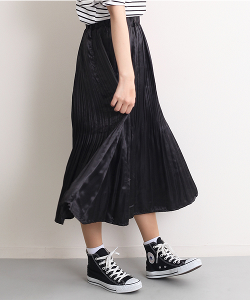 程よく上品な光沢感のある生地が華やかなプリーツスカート。丈感が長めのミモレ丈なので、大人っぽく穿けるのがポイント。 ウエスト部分がゴムなので履き心地も良いです。 ヒールからスニーカーまで選ばず、ちらっと見える足首が綺麗に見えます。 トップスはゆるっとしたオーバーサイズなニットなどと合わせるのがおすすめ。 シンプルなトップスと合わせるだけでもトレンドライクなスタイリングになってくれる、オシャレ度の高い1枚です。