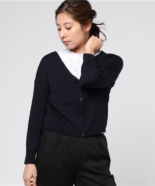 広めに開いた衿ぐりがフェミニンなVネックカーディガン。 肩を落としてオフショルとしても着こなして頂けます。 羽織りとしてはもちろん、前釦を閉じてトップスとしての着こなしもオススメ。 女性らしいアイテムなのでカーゴパンツやワイドパンツ等、メンズライクなボトムと合わせるとバランスが良いです。