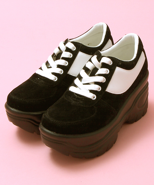 【Popteen 4月号掲載商品】 人気の厚底デザインを採用したスニーカー。サイドのラインデザインが手軽に着こなしのアクセントになります。 遊び心溢れるカラーリングに、分厚いソールが存在感を示す一足。スニーカーの合わせやすさはそのままに、デザインで違いを持たせたひと品。つま先からかかとまでのハイソールでクッション性も良く、履き心地にもこだわったスタイルアップ効果も期待できます。 お値段も手頃ですので、ご自身用は勿論、プレゼントにもオススメです。 M=23.5cm相当 L=24.5cm相当 ※履き方・足型等、個人差がございますので、あくまでも参考程度にお考え下さいませ。 ■厚底靴に関しての注意事項■ ※ファッション性を重視した商品の為、履きなれない状態での長時間の着用はお控え下さい。 ※歩くために必要な強度を保持している商品ではありますが、ファッション性を重視した商品のため、走る・跳ねる等の行為をとられた場合は瞬間的に想定以上の負荷がかかり商品が破損する恐れがありますのでご注意ください。 ※足を捻る・挫くなどして転倒しかけた際、場合によっては怪我を未然に回避する為にバンドの引き抜けや表底の剥離が発生する事がございます。 ※段差や傾斜を歩行される際には、ご注意下さい。 ※足首を痛める恐れがある為、厚底靴やヒールの高い靴を着用しての自転車のご利用はお控え下さい。 ※厚底靴を着用した状態でのお車の運転は各都道府県の条例により禁止されています。お車を運転される場合は、厚底靴の着用はおやめ下さい。